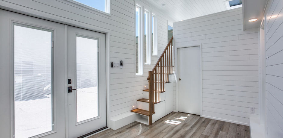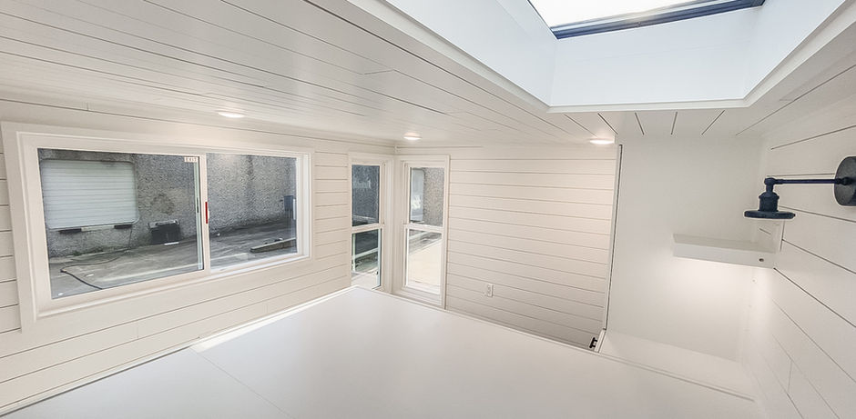 Deluxe Loft including an L-shaped Landing to access the bed from 2 sides, extra built in drawers & shelves, and extra windows. This upgrade also gives you generous exterior storage under the extra landing space